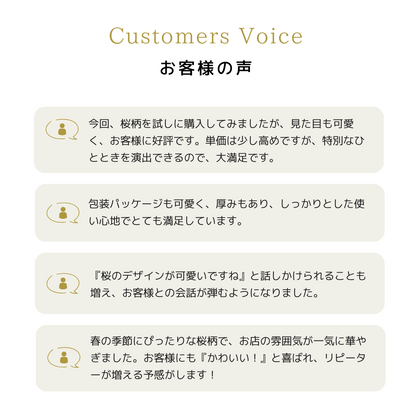 • 紙おしぼりクリールさくらに関するお客様の声。肌触りや高級感、衛生面、用途の使い分けに対する好評レビュー。