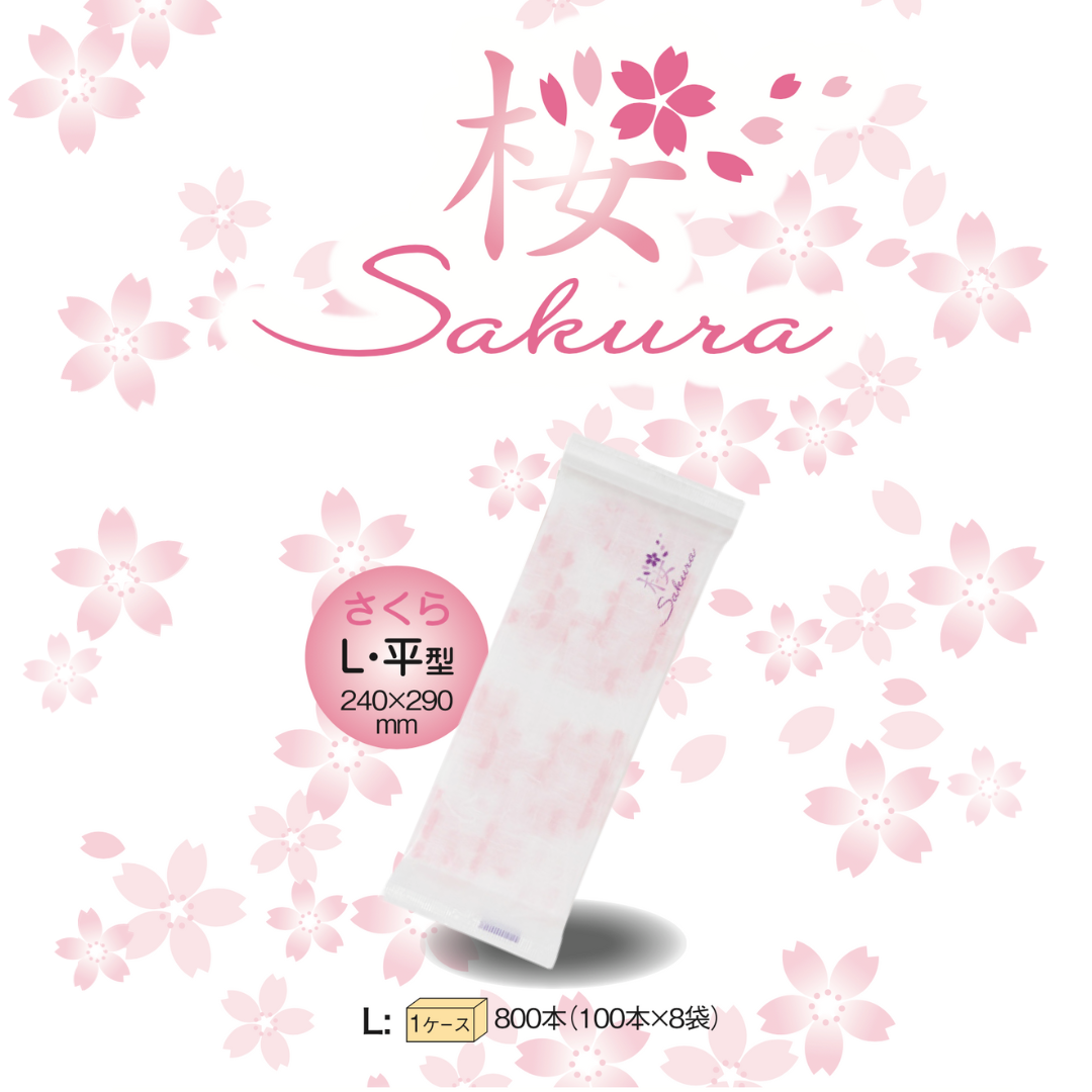 • 紙おしぼりクリール L 平型 さくら。桜柄パッケージで春らしい華やかさを演出する240×290mmサイズの日本製おしぼり。